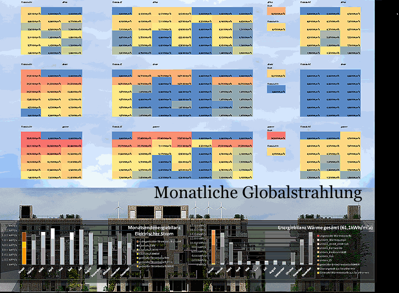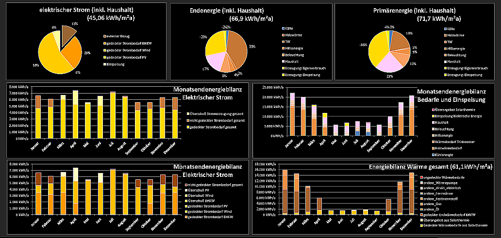 Das dynamische Gleichgewicht zwischen Bedarf und Erzeugung, d.h. der individuel- len Nutzung und der technischen Versor- gung ergab ein optimales Konzept aus BHKW- Wärmeerzeugung, Solarthermie, Photovoltaik in Dach und Fassade und einer intelligenten Gebäudeautomatisie- rung. Durch maximale gleichzeitige lokale Deck- ung des Energiebedarfs im Gebäude wird die größtmögliche Wirtschaftlichkeit und Netzunabhängigkeit des Gebäudes erreicht.