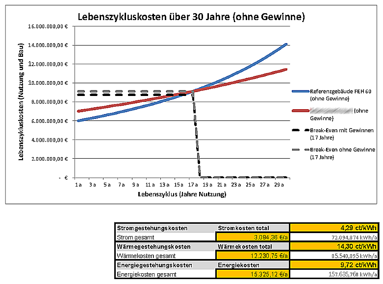 Grundlage der Betrachtungen waren Varian- tenvergleiche auf Basis der gesamten Lebenszykluskosten, d.h. der Bau- und Nutzungskosten inklusive etwa Wartung und Instandhaltung über den gesamten Lebenszyklus.